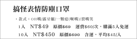 商品訊息簡述: 平均每入最低只要45元起(5入免運)即可購得搞怪表情防塵口罩1入/10入,共4款任選。